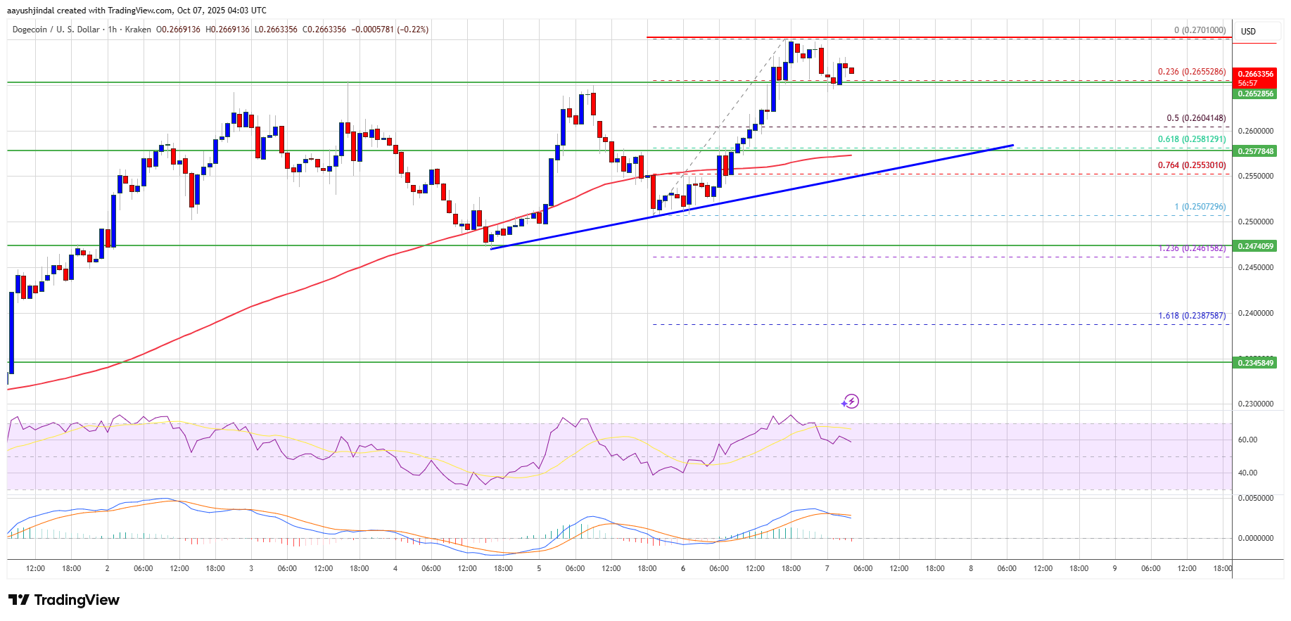 After establishing support near $0.2350, Dogecoin broke resistance at $0.250, allowing bulls to push the price toward a high of $0.2701. The meme coin now trades above $0.260, adhering to a bullish trend line with prominent support at $0.2580 on the DOGE/USD hourly chart. The technical setup remains positive as the coin stays above the 100-hourly simple moving average, with consolidation occurring near the 23.6% Fibonacci retracement level of the recent move from the $0.2507 low to the $0.2701 high.